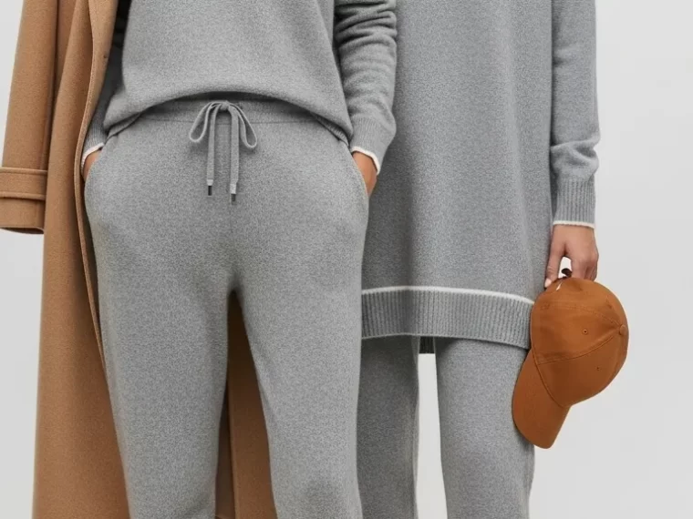 When styled with a classic camel coat and clean white sneakers, the set becomes a chic ensemble for travel or running errands. The addition of a structured leather tote bag completes the transition from homebody to cityscape chic.