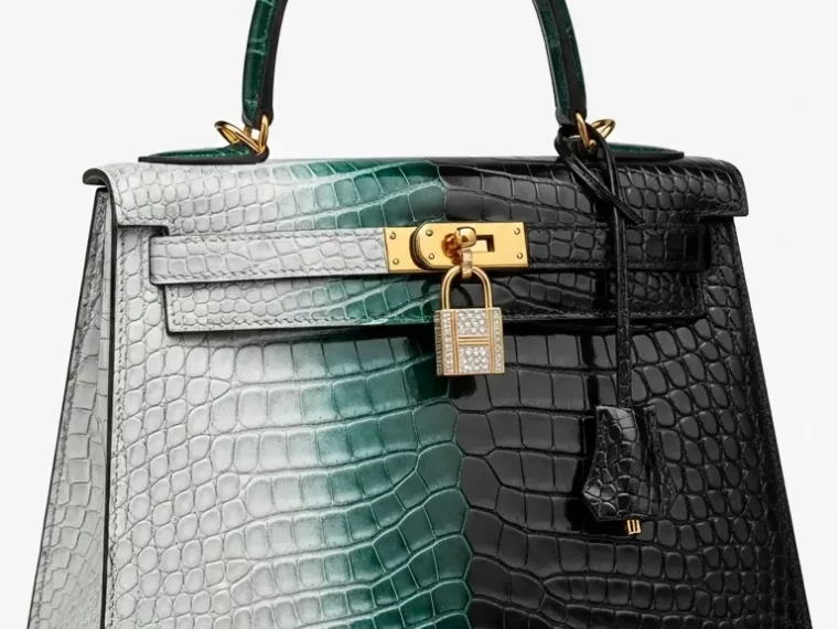 This handbag is the pinnacle of luxury and artistry. The iconic top-handle shape is rendered in exotic crocodile skin. The stunning ombré dye, fading from light to dark, makes it a true work of art.