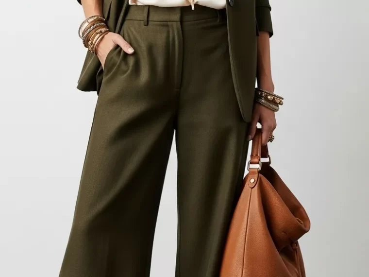 An olive green suit offers a fresh take on professional wear. The color is rich and sophisticated, moving beyond typical black or navy. Wide-leg trousers create a modern, flowing silhouette that is both powerful and comfortable.